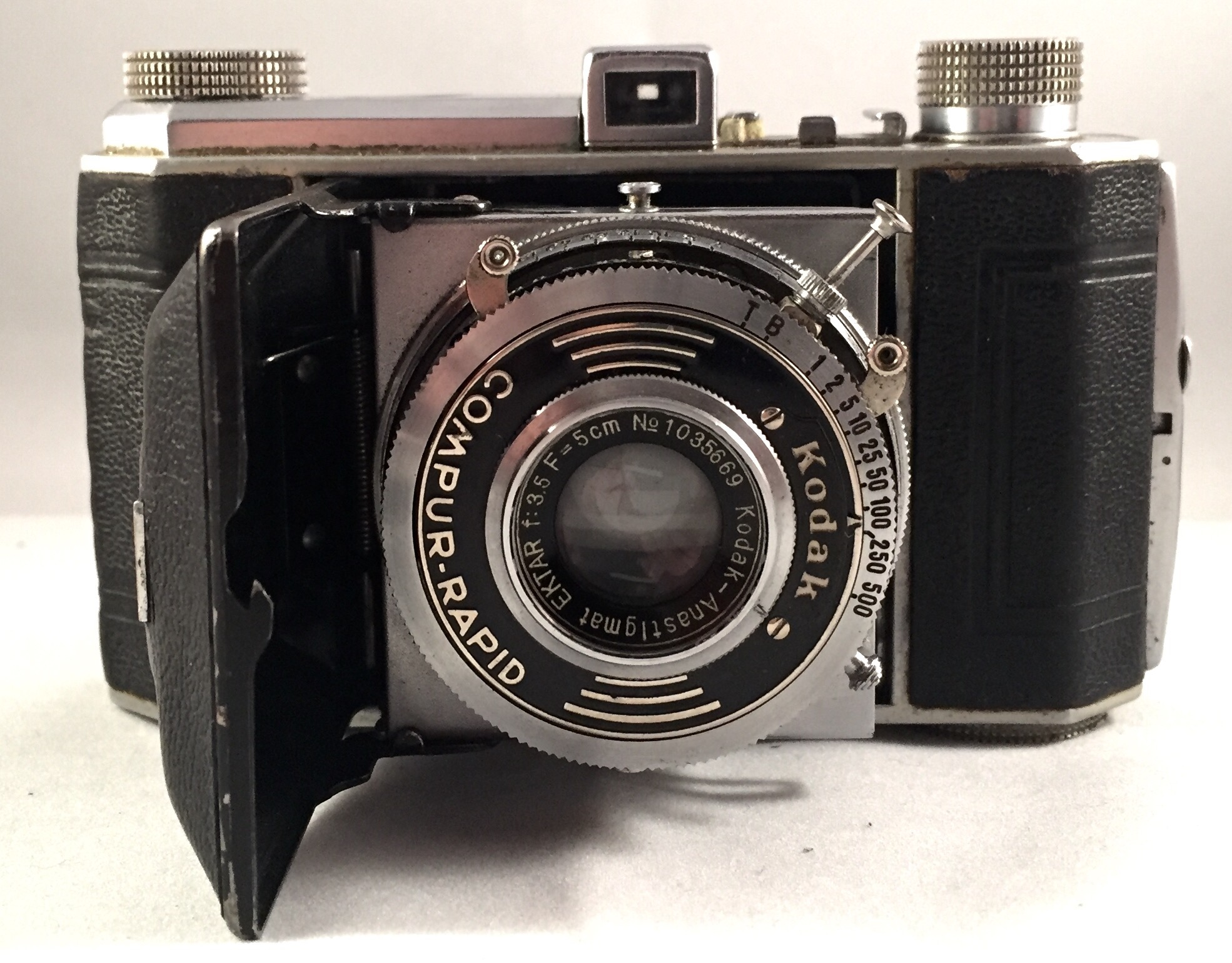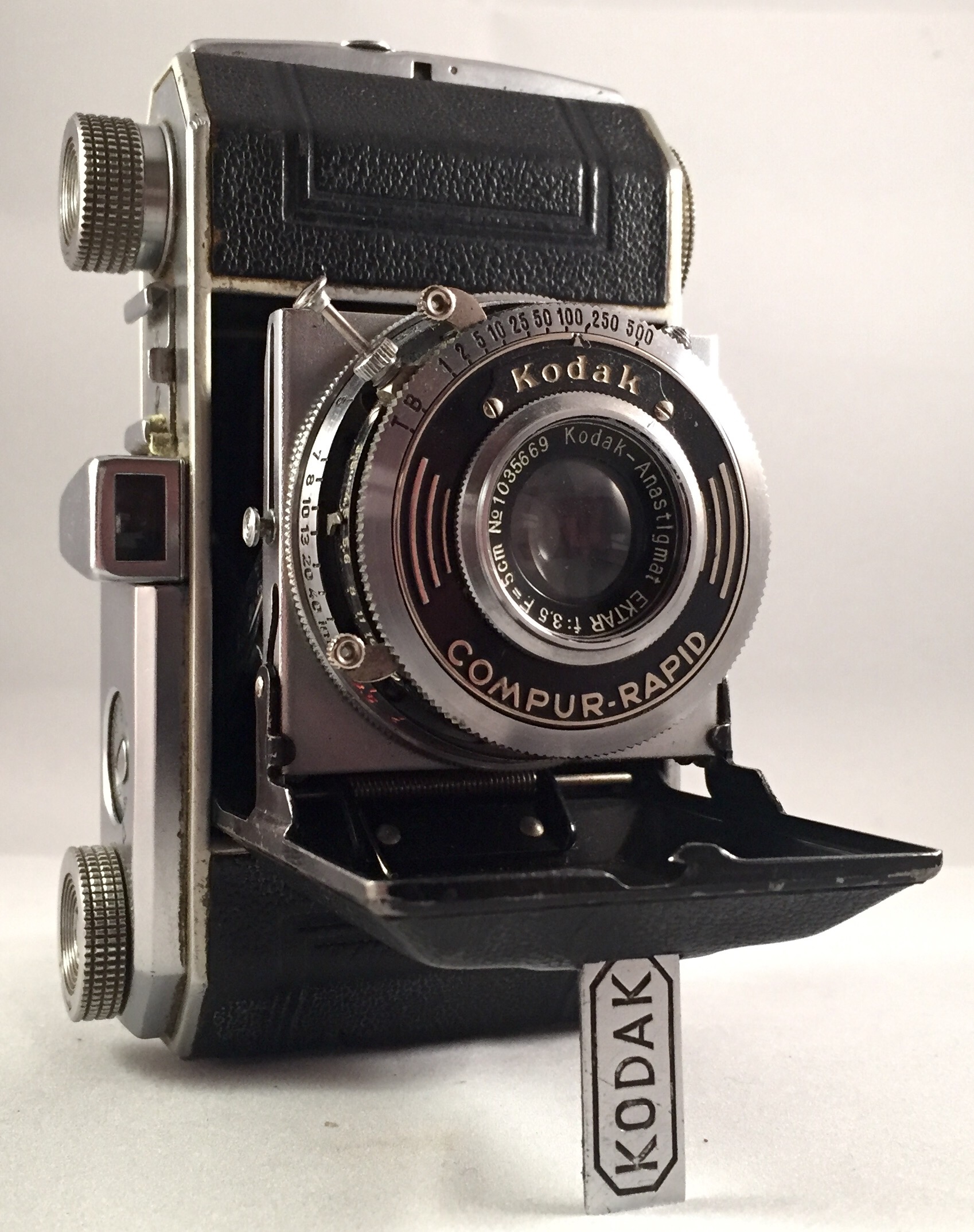 This example is fitted with a Compur-Rapid shutter and Anastigmat Ektar f/3.5 5cm lens. Other lens options include Zeiss Tessar 1:3.5 5cm, Kodak-Pupillar f3.5 5cm, or Kodak Anastigmat 1:3.5 5cm.