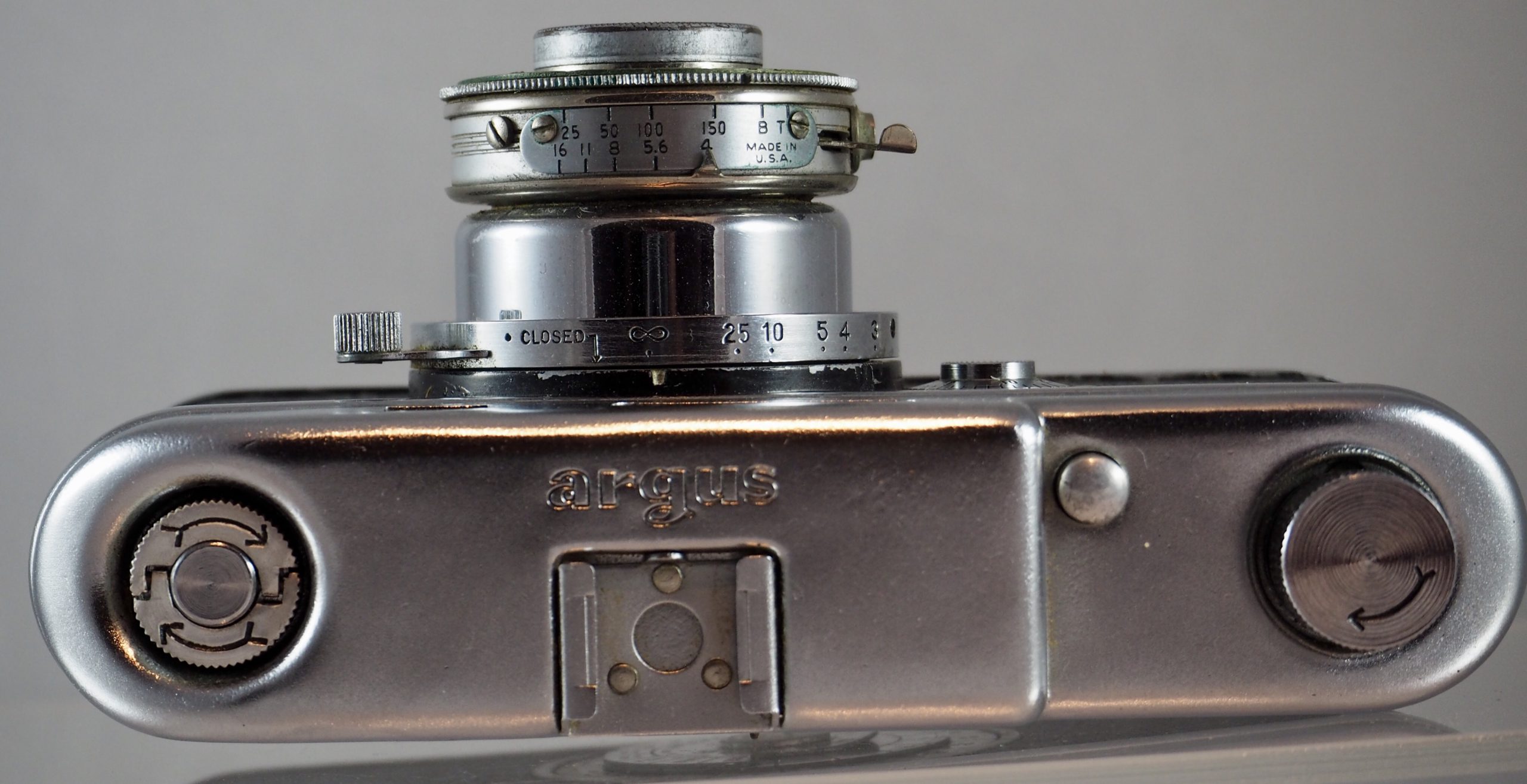 This is the Argus A3. I like it because it has more of an art deco aesthetic that its siblings, such as the Argus A, though it shares the same leaf shutter. It also has a pop-out lens barrel and extinction meter, though the one on my camera as long since been extinct.