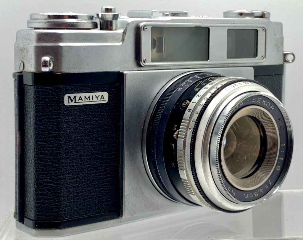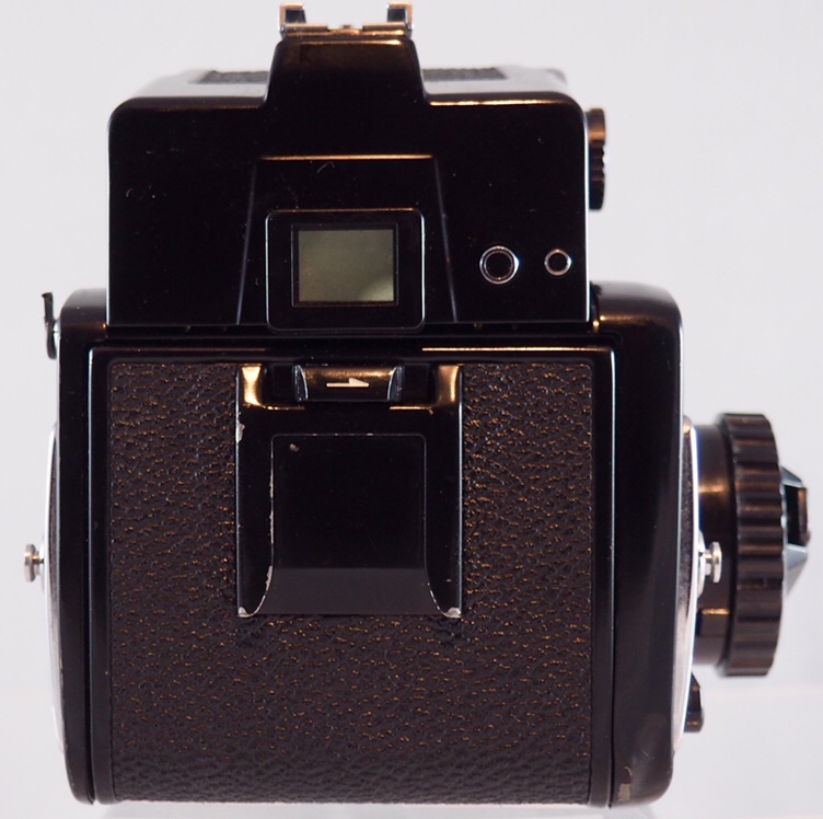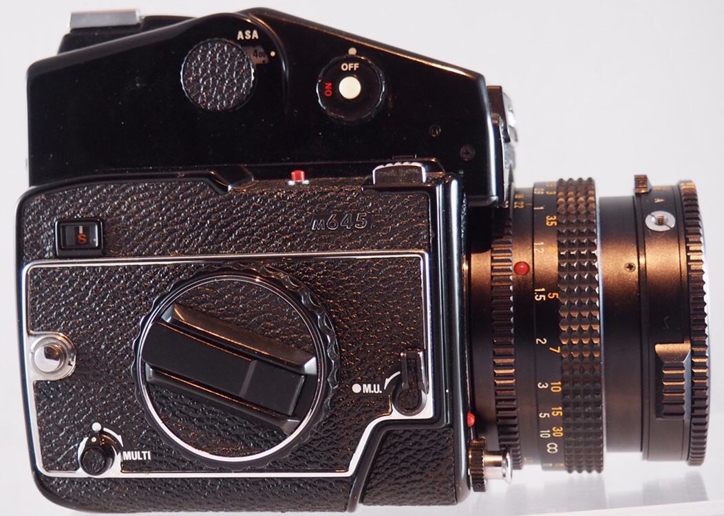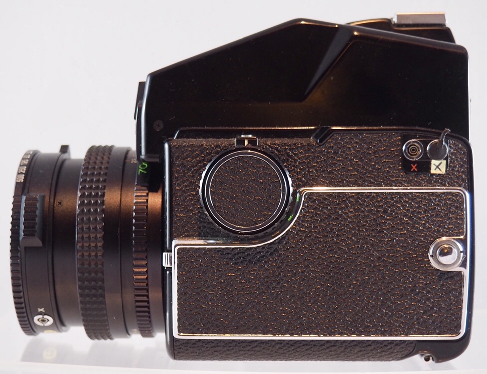 This particular camera is paired with a Mamiya-Sekor C f2.8 70mm lens, which has a leaf shutter that can be used instead of the one built into the body, and AE prism finder.